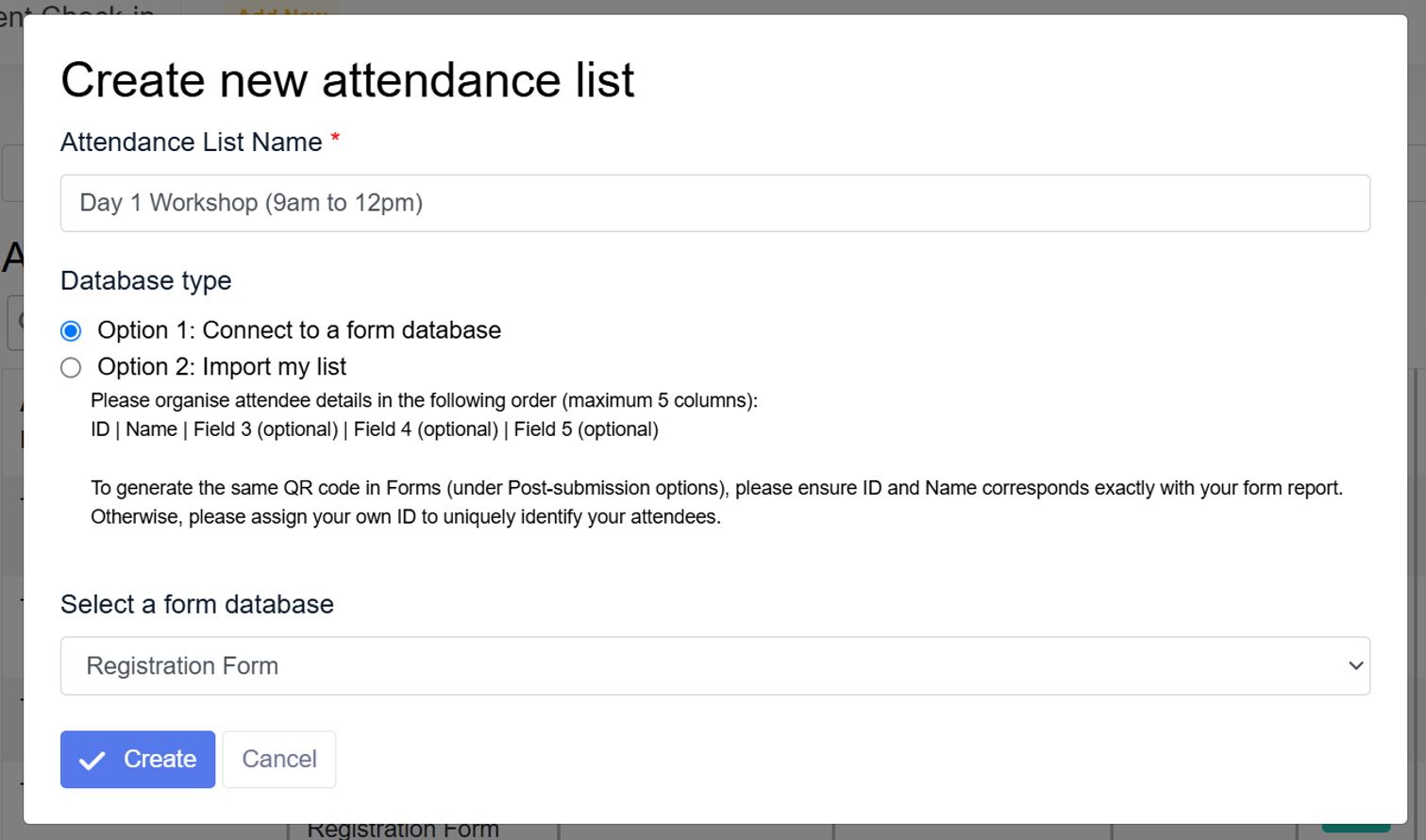 By connecting to a form, attendee data can be synced to the attendance list automatically. Both ID and Name will be retrieved and you can add up to 3 more attendee details from the form database.