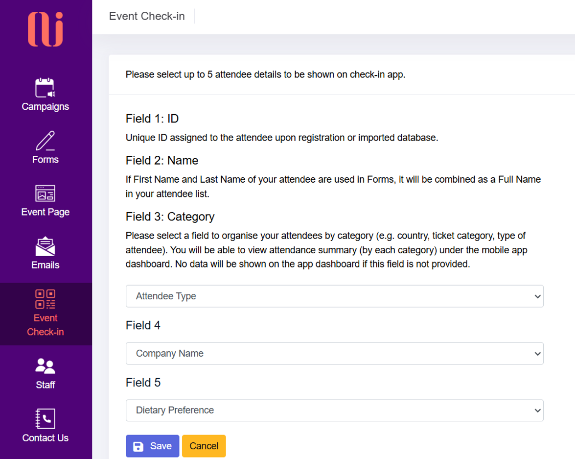 | Field 3 | Category | This optional field can be used to categorise your attendance list (e.g., country, ticket category, type of attendee) on mobile dashboard. No data will be shown on the dashboard if this field is not determined. |
