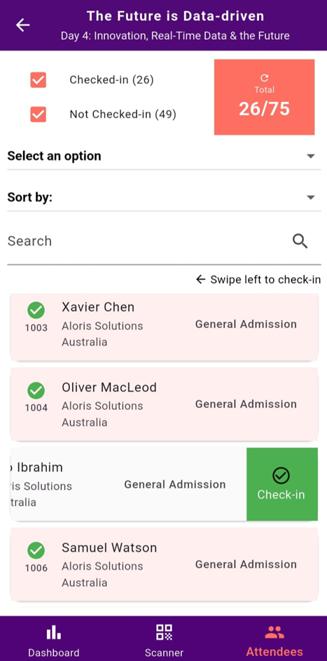 - Alternatively, toggle to Attendees to manually check in/out by swiping left on attendee’s name.